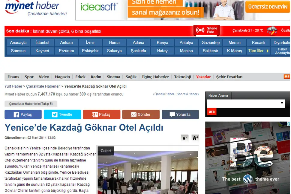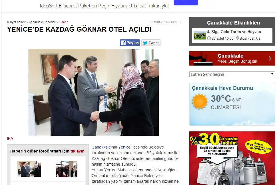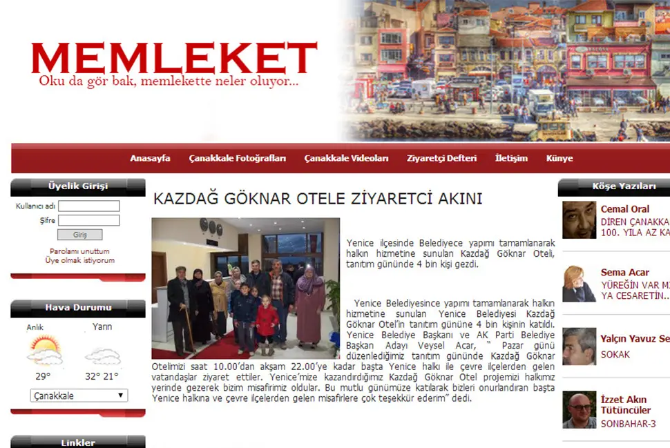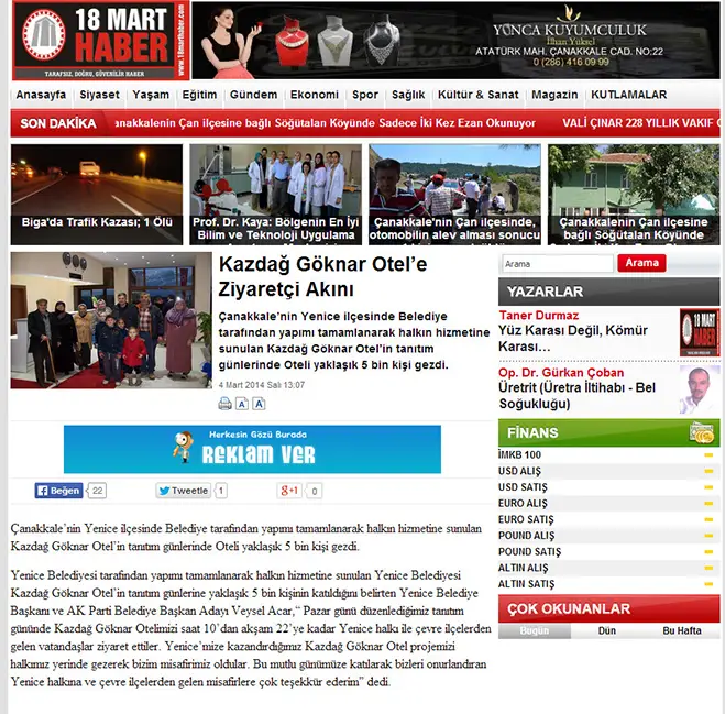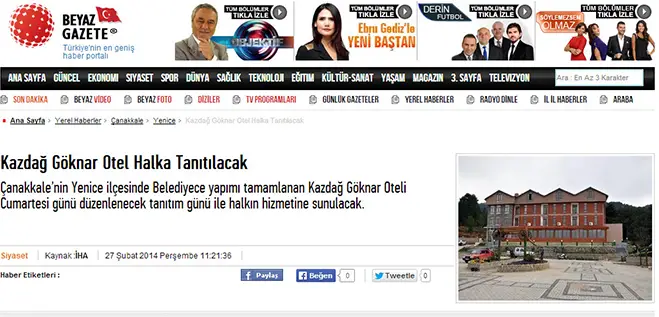 Basın HaberleriKalkınma Ajansı ToplandıBasın HaberleriYenice’de Muhteşem Gökkuşağı ManzarasıBasın HaberleriKazdağları TaçlanıyorBasın HaberleriYenice’de Kazdağ Göknar Otel Açıldı GAZETE KUPÜRLERİ Gazete Boğaz-2014Mynet Haber-2014Milliyet-2014Haber Gündem-201418 Mart Haber-2014İHA-2014Çanakkale Internet Medya-2014Haberler-2014Beyaz Gazete-2014Memleket-2014